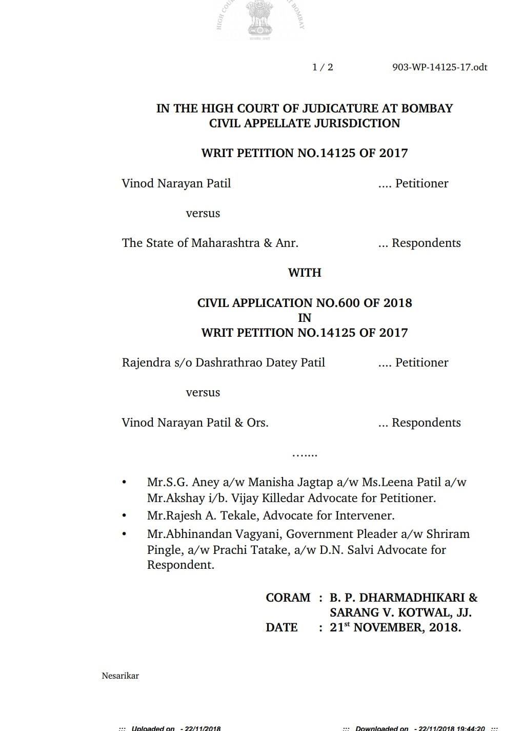 २१ नोव्हेंबर रोजी मुंबई उच्च न्यायालयात विनोद पाटील यांच्या मराठा आरक्षणावरील कालमर्यादा याचिकेवर सुनावणी करण्यात आली. यावेळी न्यायालयाने राज्य सरकारला विचारले की, आपल्याला अहवाल सादर झालेला आहे का? त्यावर राज्य सरकारने खुलासा दिला की, अहवाल सादर झाला आहे व कॅबिनेटने स्वीकारला असून यावर आम्ही तात्काळ निर्णय घेऊ.